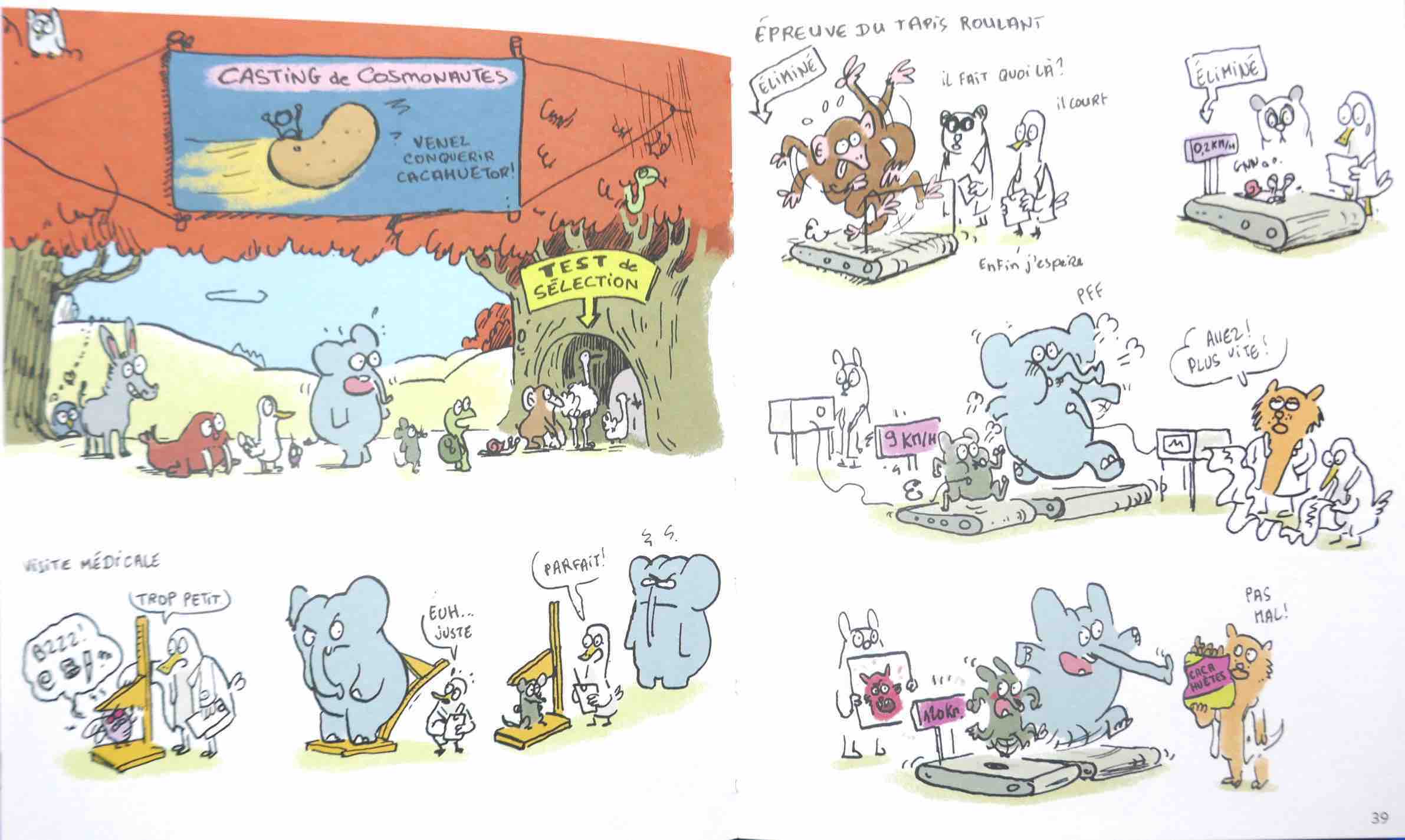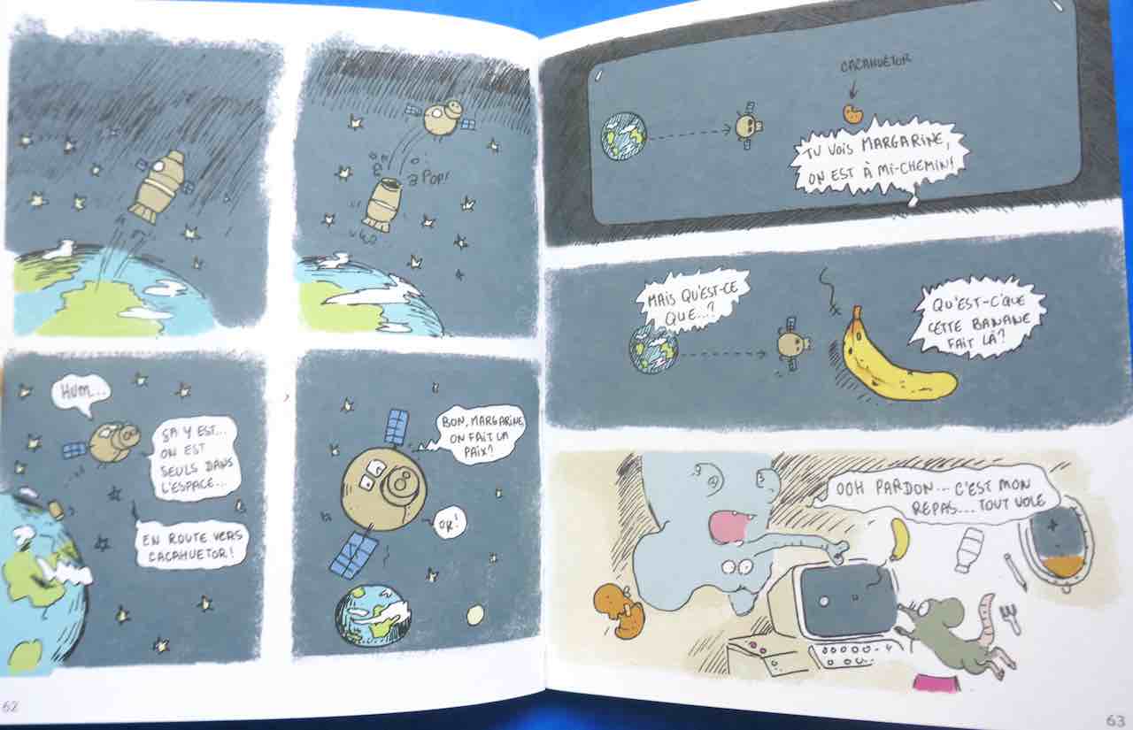 En 2009, Marion Montaigne dessinait la version courte (et loufoque) pour enfants, du voyage spatial (sans savoir qu’elle rencontrerait, quelques années plus tard, le grand Thomas Pesquet!). Ce petit livre très drôle n’est malheureusement pas réédité, mais vous le trouverez d’occasion entre 2 et 4 euros. Il plaira énormément aux enfants aimant l’humour décalé. Youri la souris et Margarine l’éléphant sont sélectionnés comme astronautes pour ramener Cacahuetor, une comète en forme de cacahouète. Vous l’aurez compris, il s’agit davantage de s’amuser que de s’informer, mais ce livre vaut son pesant de cacahouètes !