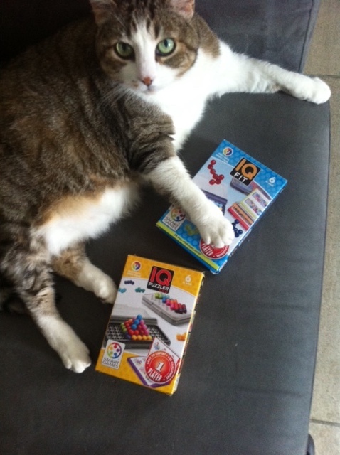 Les IQ sont petits par la taille (mon chat est là pour le prouver, sa manière à lui de mettre la patte à la pâte), mais ils sont grands par leur ingéniosité. Un plateau, des pièces, un livret présentant des défis de difficulté croissante (un schéma indique comment placer quelques pièces, puis le défi consiste à insérer toutes les pièces restantes, les solutions se trouvant en fin de livret, 120 défis différents par jeu).
