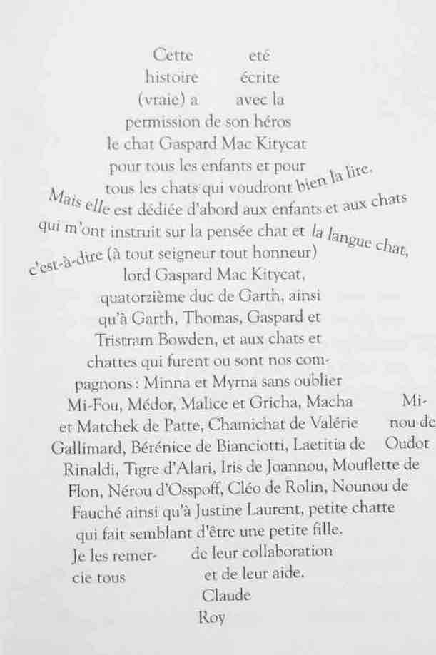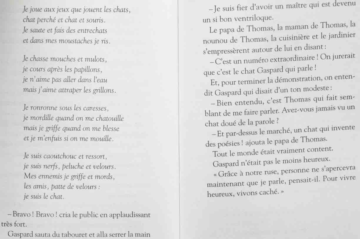 Tout a commencé avec le chat de l’académicien Claude Roy ! C’était inévitable car les écrivains passent énormément de temps assis à la recherche de la phrase juste, en observant leur chat. L’auteur, ayant découvert le secret grâce à son chat trop bavard, a décidé d’en faire un livre. Il brode ainsi l’histoire de Thomas, un petit garçon, et de son chat Gaspard. Thomas découvre que Gaspard est capable de parler comme un humain. Ce chat parle même beaucoup ! En prose et en vers. Car Gaspard se révèle poète ! le petit garçon désire garder le secret de peur qu’on ne lui enlève son compagnon. Mais le chat parle malgré lui, devant tout le monde. Thomas met donc en place un subterfuge : il se fait passer pour ventriloque. Le problème étant que l’enfant ne maîtrise pas ce que raconte le chat…