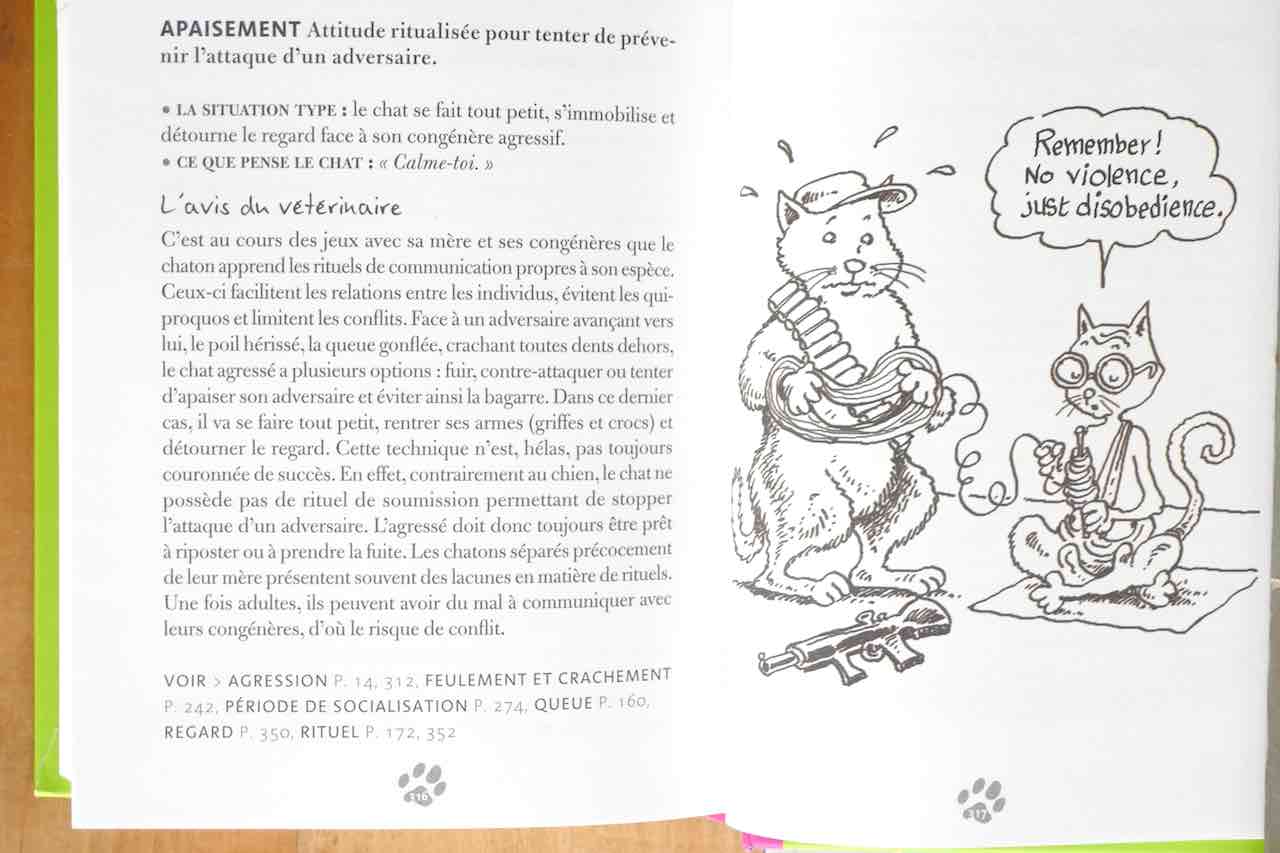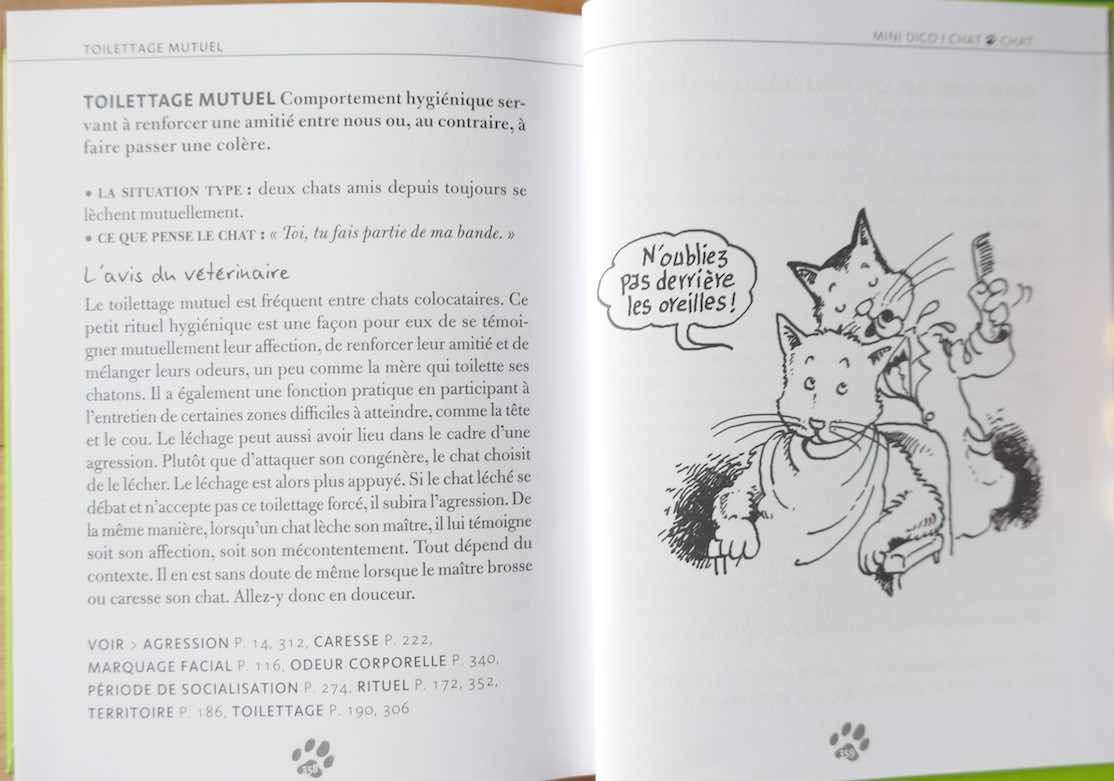 Ce petit dictionnaire est parfait pour tous les amoureux des chats désirant encore mieux nous comprendre. La présentation est ludique et je m’attendais à quelques définitions drôles mais sans vraie connaissance de nos habitudes. Eh bien, pas du tout ! L’auteur connaît bien les chats et semble les aimer sincèrement. Ce qui est étonnant puisqu’il s’agit d’un vétérinaire ! Moi qui pensais que ces humains en blouse blanche représentaient le pire fléau pour un animal ! Il semblerait qu’en fait, ils en savent beaucoup ! Par exemple, pour le mot ‘gamelle’ (oui, c’est le premier mot que j’ai cherché), il explique qu’on n’aime pas les gamelles en plastique ! Un point pour l’auteur ! Pour le mot ‘eau’, qu’il faut déposer l’eau loin de notre nourriture. Et un autre point pour l’auteur !