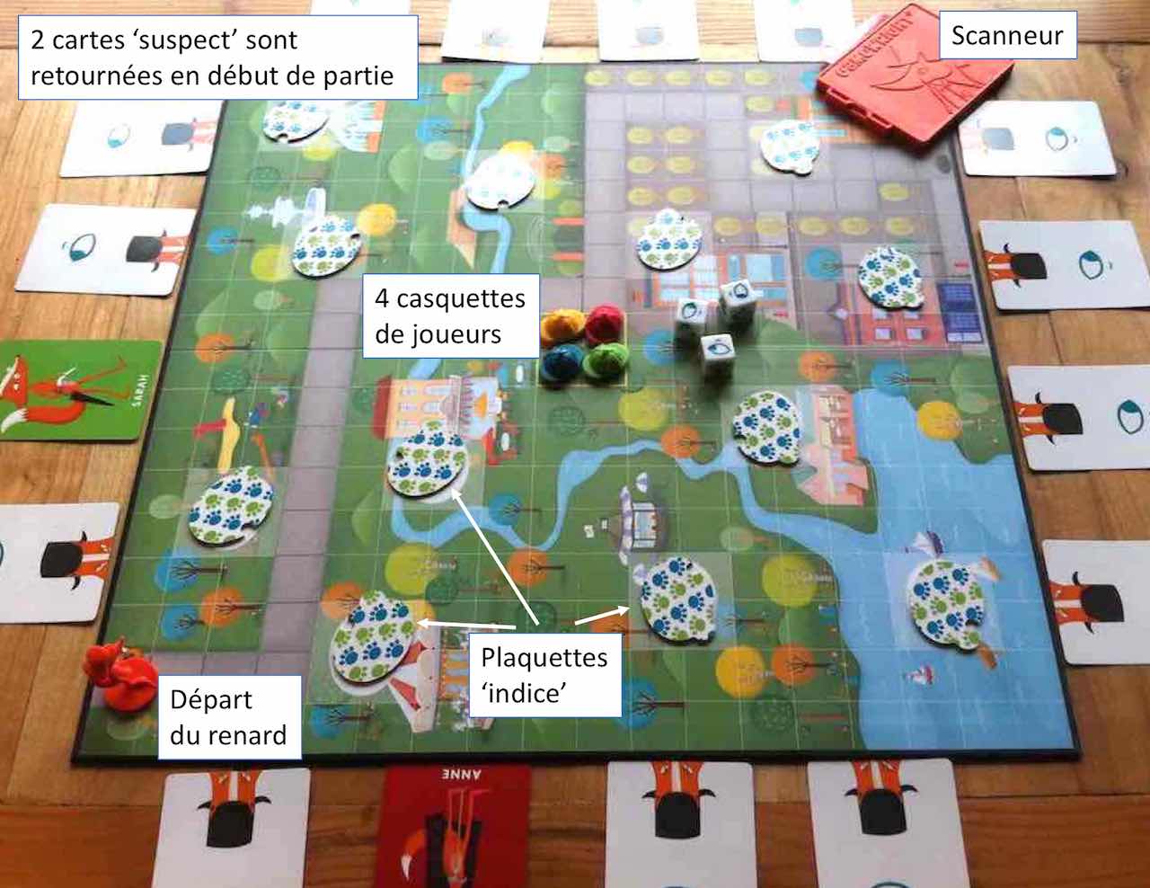 - Nom d’un Renard ! est un jeu coopératif, donc un enfant de 5 ans ne sera jamais perdu car c’est collectivement que se font les déductions. Ce qui n’empêche pas l’enfant de choisir au moment de son lancer de dés entre retourner une carte ‘suspect’ ou une plaquette ‘indice’. Et les autres joueurs peuvent lui laisser le temps de faire ses propres déductions avant de l’aider si nécessaire (l’aider, pas lui donner la solution ;-), ce qui l’entraîne sans stress à raisonner logiquement.