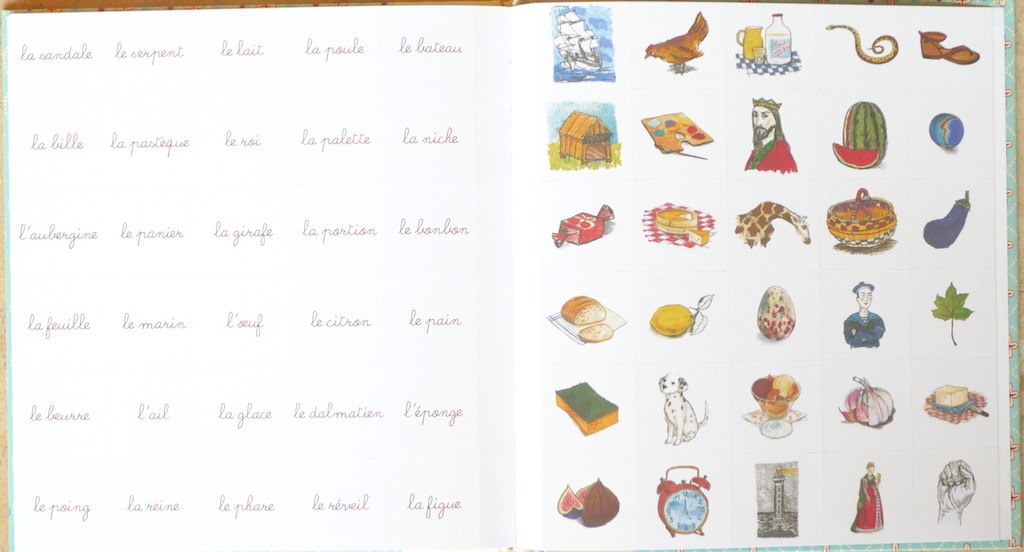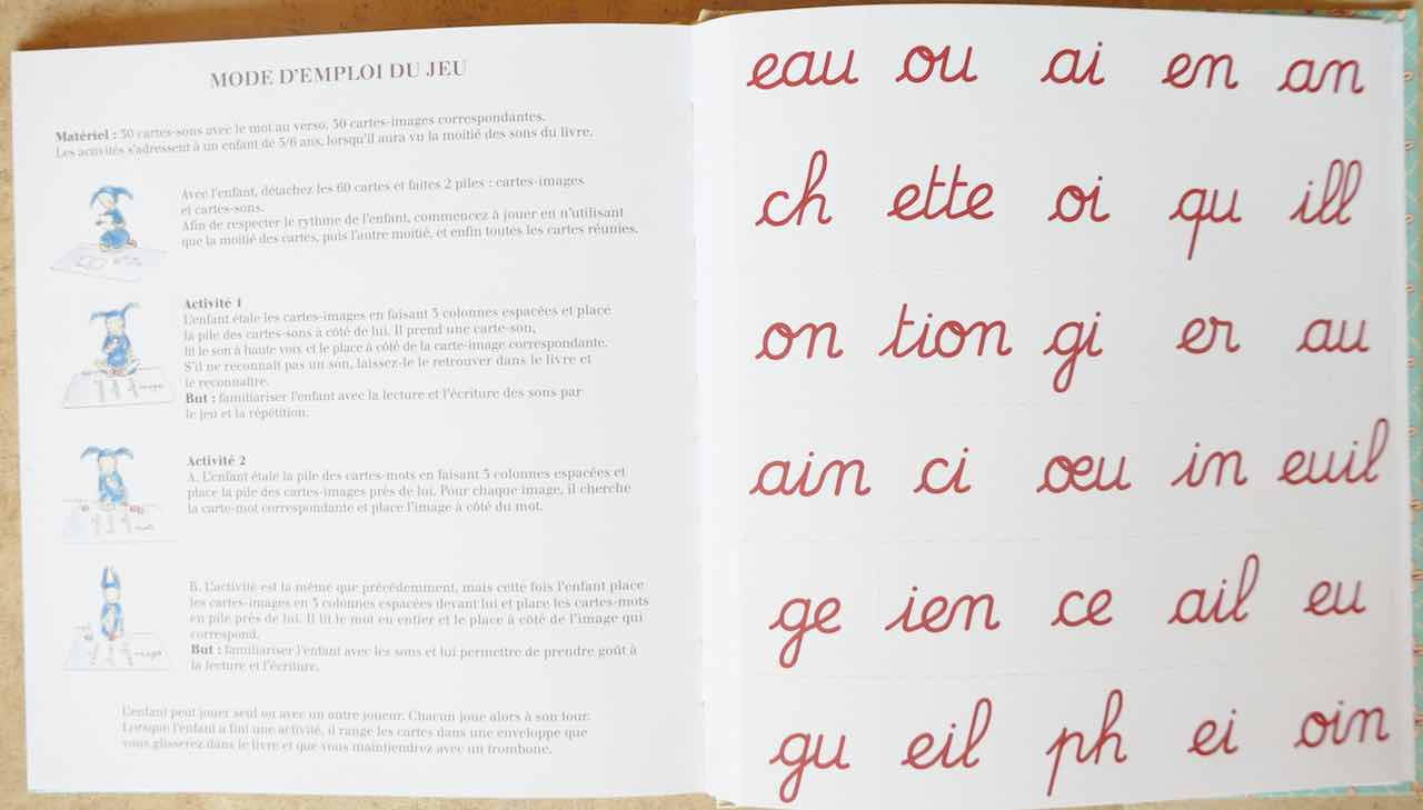 Chaque son est présenté sur une double page. Il y a 30 sons différents. Pour chacun, l’enfant nomme les images, reconnaît le son, apprend son écriture, et découvre une phrase regroupant des mots avec ce même son. Il peut ensuite jouer avec les cartes pour vérifier ses acquis. Je vous laisse cliquer sur le diaporama pour découvrir les détails.